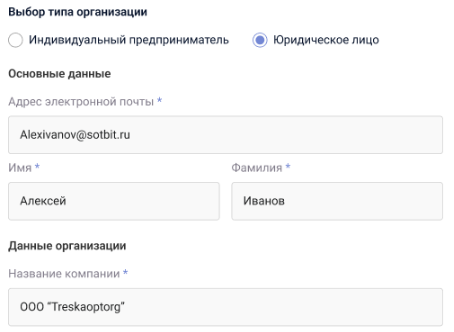Для получения доступа в личный B2B кабинет, контрагенту необходимо пройти регистрацию. Он должен заполнить личные данные о себе, а также указать реквизиты своей компании. Для удобства предусмотрено автоматические заполнение реквизитов по ИНН. При необходимости, Вы можете включить модерацию заявок на регистрацию, тогда для доступа в B2B кабинет, контрагенту необходимо получить одобрение от вашей компании.
